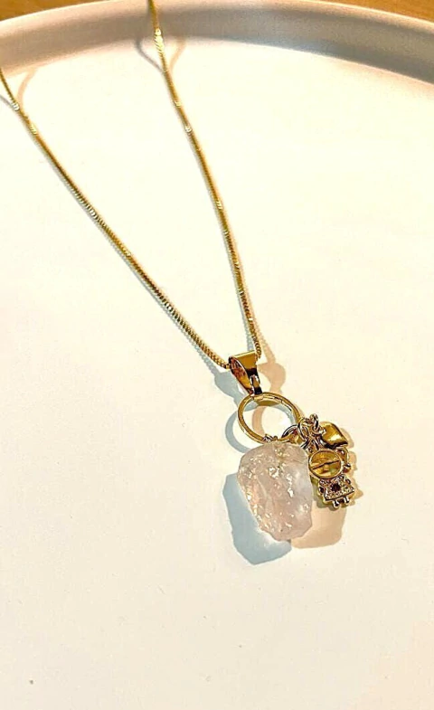 Colar veneziana banhado a ouro com pingente em pedra da lua, com representação de uma menina.